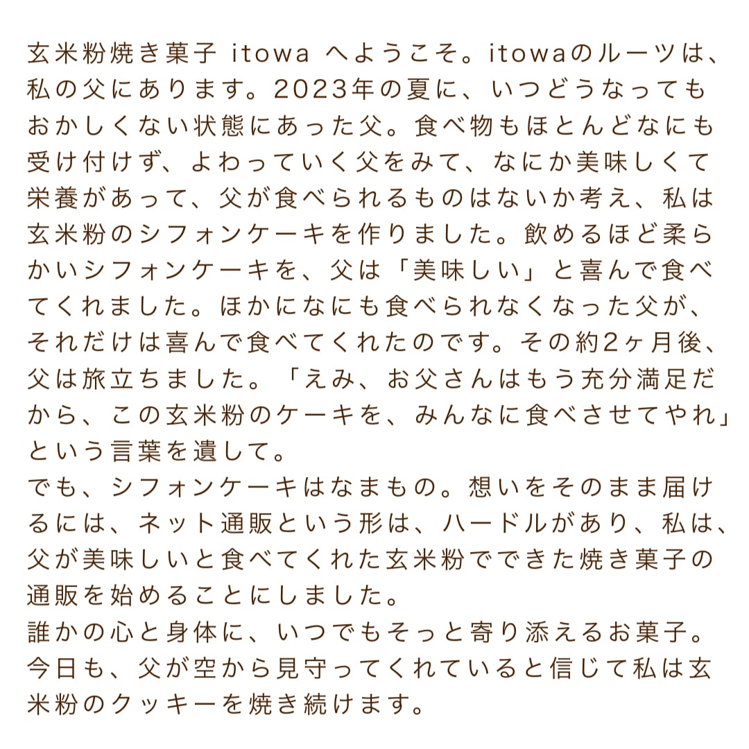 公式LINEお友だち追加で 送料無料クーポンコードが今すぐGETできます! 必ずお友だち追加して、送料無料でご注文ください。 @ixt2639c 【当店一番人気】 手づくりおやつ玄米粉クッキー グルテンフリー 心と体にやさしいおやつをお届けします。 itowaの【手づくりおやつ玄米粉クッキー】は、厳選された香ばしい玄米粉を使用した、グルテンフリーのクッキーです。 メープルシロップやきび砂糖の自然な甘さが、毎日のティータイムを特別なひとときに演出します。 今回ご紹介するのは、食べ応え満点の贅沢なバリエーション! 贅沢3種セット(各2袋ずつ) • メープルクッキー(3個入り)×2袋 • 黒ごまザックザククッキー(2枚入り)×2袋 • 濃厚ココアクッキー(2個入り)×2袋 合計6袋(14個)入りです。 ☆賞味期限 2026年2月5日 保存料は使用しておりませんのでお早めに召し上がってくださいね ☆発送 2025年1月6日より順次発送 ☆こんな想いを込めています☆ 市販のおやつでは感じられない、玄米粉の香ばしさとメープルシロップの優しい甘さを一口で味わっていただけます。素材本来の風味を大切に、手作りで仕上げていますので、どなたにも喜ばれる“おとなのおやつ”として人気です。 特別な日のギフトにも、自分へのご褒美にもぜひお楽しみください。 ☆こんな方におすすめ - グルテンフリーなおやつを探している方 - 健康的なおやつを楽しみたい方 - いつもと違うおやつを試してみたい方 - 自分へのご褒美に、ちょっと贅沢なおやつをお求めの方 あなたの特別なひとときを、ぜひこのクッキーと共にお過ごしください。 ご注文をお待ちしております。 【原材料】 〈メープルクッキー〉 玄米粉・メープルシロップ・米油・アーモンドプードル・片栗粉・塩※一部に、アーモンドを含む 〈ザックザククッキー〉 玄米粉・アーモンドプードル・米油・鶏卵・メープルシロップ・黒ごま・グラニュー糖※一部に、卵、アーモンド・ごまを含む 〈濃厚ココアクッキー〉 玄米粉・バター・コーンスターチ・ココア・ブラックココア・きび砂糖・水・塩※一部に、乳成分を含む ※当工房では、小麦製品を取り扱うこともあります。 【配送】 ・常温発送(ポスト投函・クリックポスト予定) ・ポスト投函のため、日時指定はできません ・簡易包装にてお届けします ・送料全国一律 ※シンプルなお包装ですが、心を込めてお作りしています。 【ご注意】 ・ひとつひとつ手作りのため、形や色に多少の違いがあります ・画像はイメージです。多少異なることがあります ・数量限定のため、無くなり次第終了いたします ・丁寧な梱包を心がけていますが、クッキーは割れやすくとても繊細です。配送時に割れる可能性があることを、あらかじめご了承のうえご注文ください。 配送中の破損に関しましては責任を負いかねます。重ねてご了承ください。